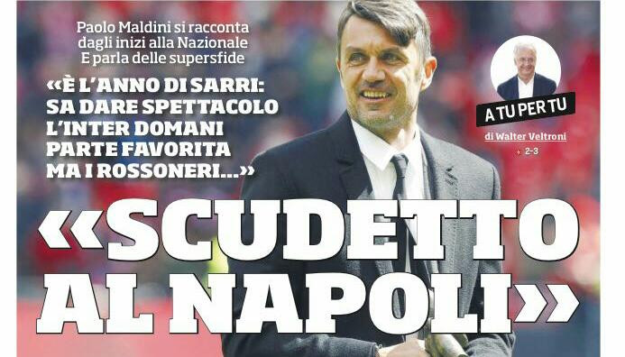 “Scudetto al Napoli”, ecco il titolo sulla prima pagina del Corriere dello Sport che apre con l’intervista esclusiva a Paolo Maldini che si racconta alle colonne del quotidiano. In taglio alto spazio agli anticipi di oggi, da Juve-Lazio a Roma-Napoli, ma ecco anche il derby di Milano di domenica. In basso, invece, si legge dell’anticipo di Serie B tra Foggia e Perugia ed un boxino è dedicato al calcio estero con Mourinho che “vuole la storia”. “Mazzate” è l’apertura di Tuttosport, a sinistra invece: “Toro, rinnovo Belotti” e “Di Francesco: ‘Decisiva? Quasi’. E Sarri ripassa il… Sassuolo”. Su La Gazzetta dello Sport è “Tutti contro tutti”, saranno due giorni di svolta per il campionato con partite importanti: Juventus-Lazio, Roma-Napoli e Inter-Milan.