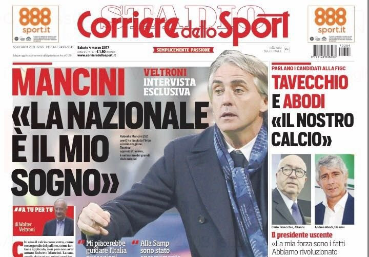 Il Corriere dello Sport intervista Roberto Mancini. “La Nazionale è il mio sogno” confessa l’allenatore, che dunque si candida come commissario tecnico dell’Italia per il futuro. Di spalla, un confronto tra i due candidati per la presidenza della FIGC, Tavecchio e Abodi. In taglio basso, la presentazione di Roma-Napoli, “una sfida Champions”.