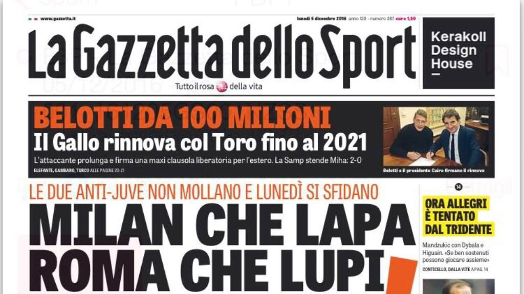 “Milan che Lapa, Roma che lupi”: La Gazzetta dello Sport esalta i rossoneri e il suo centravanti e i giallorossi dopo la vittoria nel derby. “Belotti da 100 milioni”, in alto spazio anche al rinnovo del centravanti del Torino.