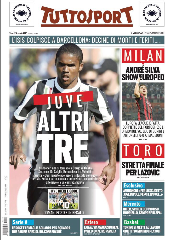 Meno uno, poi ci siamo: sabato sarà di nuovo Serie A. Intanto il Milan archivia la qualificazione all’Europa League con un netto 6-0 e il calciomercato non si ferma. “Juve, altri tre”, è l’apertura di Tuttosport. Di spalla lo “show europeo” di André Silva e una notizia sul Torino: “Stretta finale per Lazovic”. Su Il Mattino di Napoli si parla già di campionato: “Assalto alla Juve, Napoli avanti a tutti”, mentre il Corriere dello Sport torna a parlare del mercato bianconero con tre colpi prenotati: Spinazzola, Keita e Garay. In alto il “Milan Show”. Su Gazzetta dello Sport, invece, è “Milan Macedonia di gol”. In taglio alto spazio anche alla strage di Barcellona con delle immagini molto toccanti: “Terrore a Barcellona, furgone sui turisti. Sulla Rambla 13 morti”.