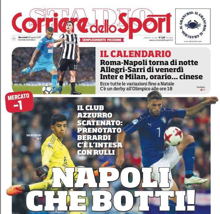 “Napoli, che botti” è l’apertura del Corriere dello Sport che spiega come il club azzurro sia scatenato. Prenotato Berardi, c’è l’intesa con Rulli. Contattato il Sassuolo per avere l’opzione sull’attaccante. Accordo per la prossima stagione con il portiere della Real Sociedad. Continua il pressing per Denis Suarez. Laxalt la chiave per Spinazzola il taglio basso di mercato.