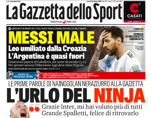 La disfatta dell’Argentina al Mondiale, il mercato dall’altra. C’è questo e molto altro sulle prime pagine questa mattina in edicola: si parte però da Nainggolan e dall’Inter su La Gazzetta dello Sport, con le prime parole da nerazzurro del belga (“L’urlo del Ninja“). In alto, invece, focus sulla sconfitta dell’Albiceleste a Russia2018 (“Messi Male“).