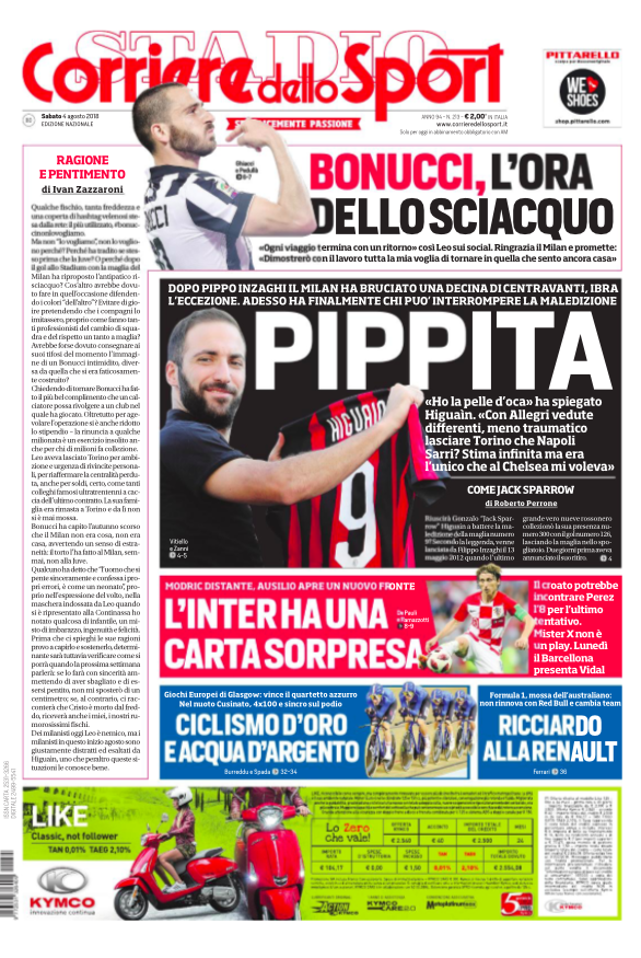La prima pagina del Corriere dello Sport di domani punta su un gioco di parole (“Pippita“) per il nuovo attaccante del Milan, Gonzalo Higuain, con l’ex Juve alla ricerca di una maledizione sulla maglia numero 9 da interrompere dai tempi di Inzaghi. Taglio alto dedicato a Bonucci (“L’ora dello sciacquo“), pronto a ripartire dalla Juventus, mentre in basso l’attenzione va alla ricerca del centrocampista per l’Inter (“L’Inter ha una carta a sorpresa – Modric distante, Ausilio apre a un nuovo fronte“).