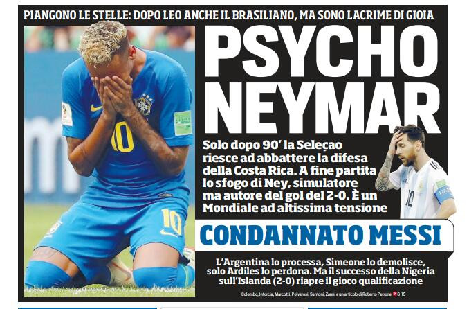 Apertura dei giornali in edicola di domani dedicata al calciomercato e ai Mondiali. Il Corriere dello Sport scrive: “Psycho Neymar”, con riferimento alle lacrime di O’Ney dopo la vittoria contro la Costa Rica. Lacrime di gioia e liberazione dopo una partita complicata. Sotto invece si parla di Milan (futuro societario) e Sarri (in proiezione Chelsea).