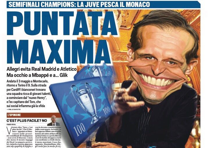La Juventus pesca il Monaco in semifinale di Champions League e le prime pagine dei quotidiani sportivi sono dedicate alla sfida dei bianconeri. Si parte con Tuttosport che titola: “Puntata Maxima”, con un Allegri sorridente che campeggia sullo sfondo. In taglio basso spazio al Torino: “Fidati di Miha”. Si prosegue con l’Inter: “Oriali verso il ritorno”.