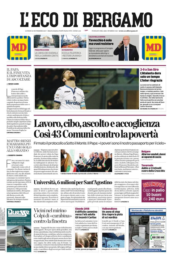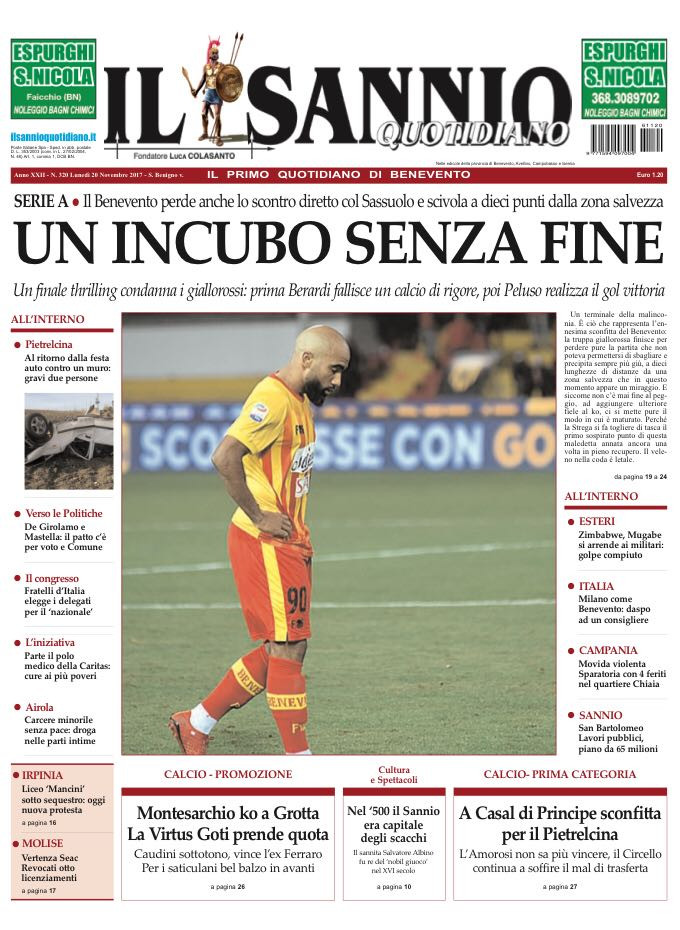 Su QS le due facce della medaglia: Inter a testa alta e Juventus a testa bassa. La Gazzetta del Mezzogiorno scrive: “La Juve frana, solo l’Inter frena la fuga del Napoli”. Il Mattino: “La Juventus cade, il Napoli allunga ma l’Inter insegue”. L’Eco di Bergamo dà spazio all’Atalanta che “dura solo un tempo” contro l’Inter. Il Sannio parla dell'”incubo sena fine del Benevento” mentre l’Unione Sarda esalta il Cagliari che “sbanca Udine”. Il Giornale di Sicilia dà spazio al Palermo: “L’incubo crac, il presidente: ‘I conti a posto'”. Sulla Gazzetta di Parma si parla del rinnovo di D’Aversa fino al 2019 mentre la Città scrive del pareggio della Salernitana contro la Cremonese.
