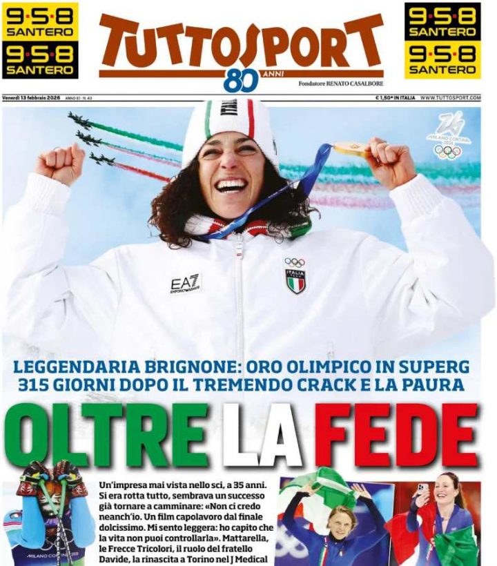 La Gazzetta dello Sport apre ripercorrendo il successo ai giochi invernali di Milano-Cortina di Federica Brignone. A distanza di pochi mesi dall’infortunio l’italiana conquista l’oro nel SuperG femminile.