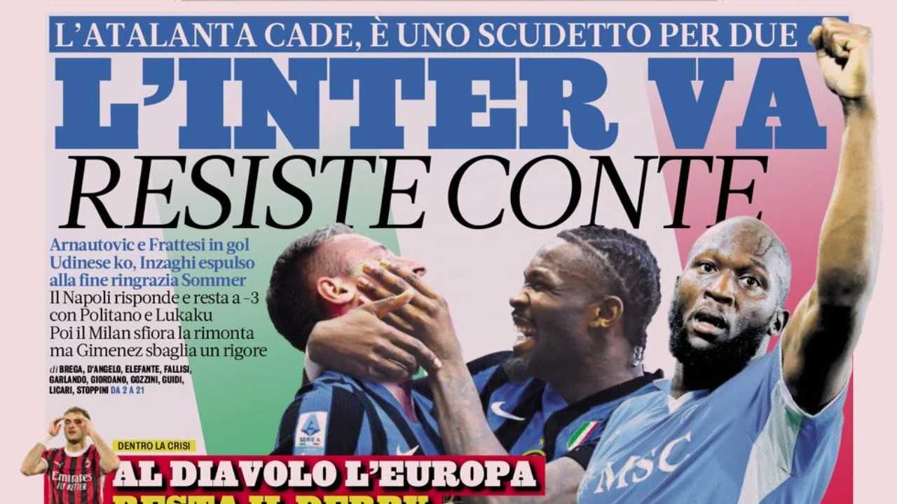 “L’Inter va. Resiste Conte” è il titolo della Gazzetta dello Sport. Il riferimento, chiaramente, è ai risultati raccolti dall’Inter e dal Napoli nell’ultimo turno di Serie A. I nerazzurri hanno vinto 2-1 contro l’Udinese. La squadra campana, con lo stesso risultato, ha superato il Milan.