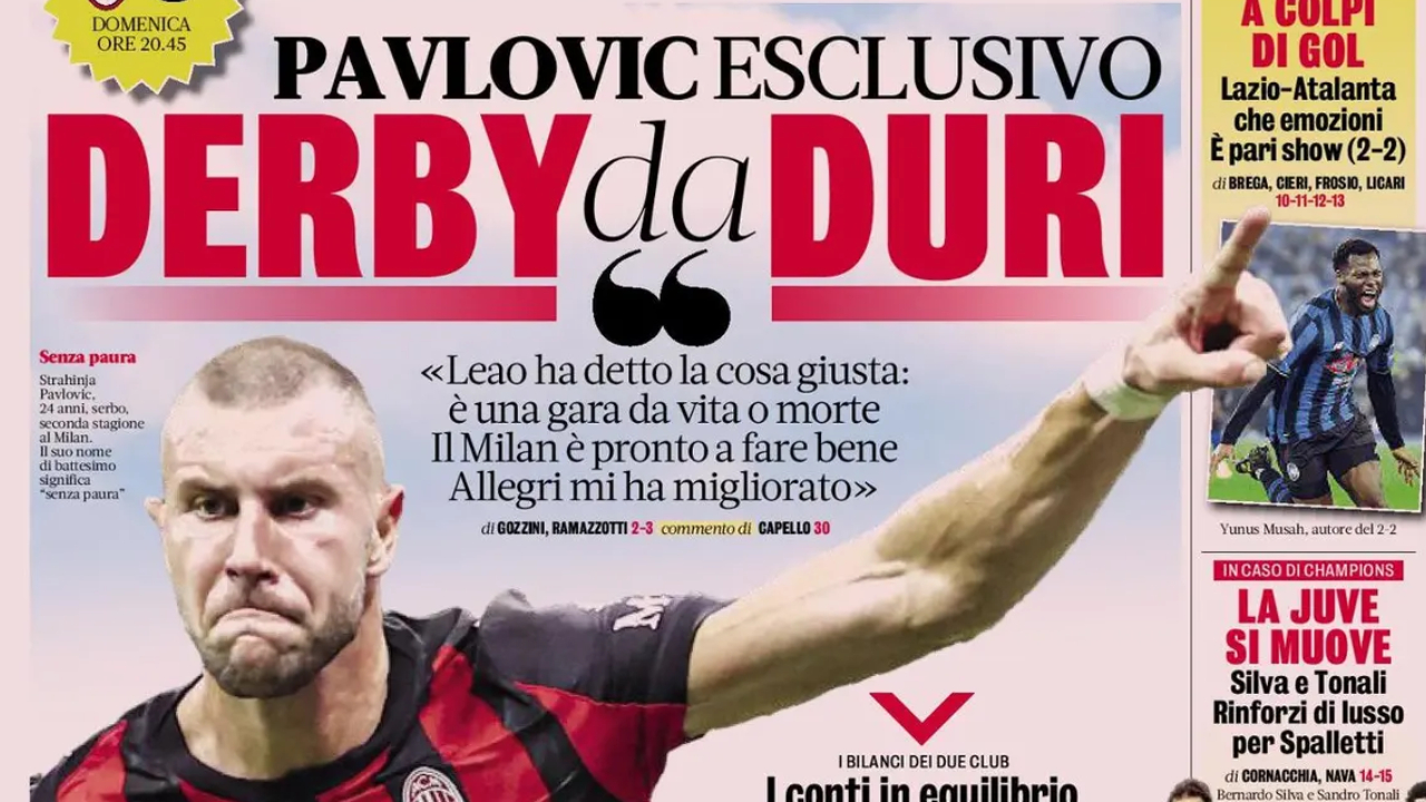 La Gazzetta dello Sport apre con un’intervista a Pavlovic verso il derby: “Derby da duri. Il Milan è pronto a fare bene, Allegri mi ha migliorato“.