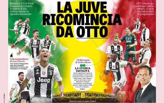 Le prime pagine dei quotidiani sportivi (e non) in edicola oggi si concentrano sulla vittoria dell'ottavo scudetto della Juventus. Ma anche sulla lotta per la Champions League con il pareggio nel posticipo di San Siro tra Inter e Roma. Spazio anche per la promozione in Serie B della Juve Stabia.