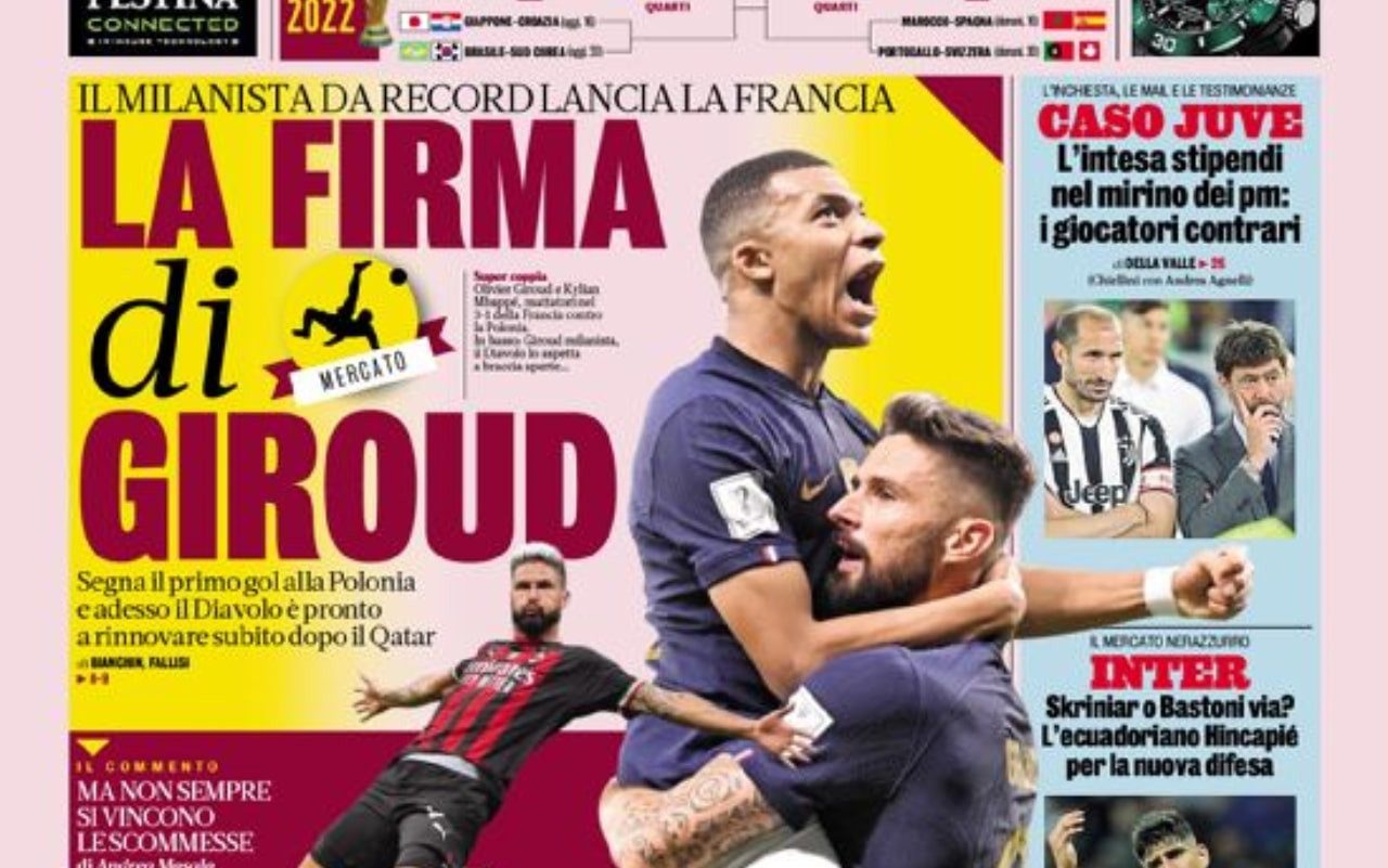 La Francia batte la Polonia e vola ai quarti di finale, dove affronterà l’Inghilterra (QUI il tabellone completo), che nel match serale ha battuto il Senegal per 3-0. Oggi tocca invece a Croazia e Brasile, rispettivamente contro Giappone e Corea del Sud. Questo e molti altri temi nelle prime pagine dei quotidiani sportivi in edicola oggi, lunedì 5 dicembre.