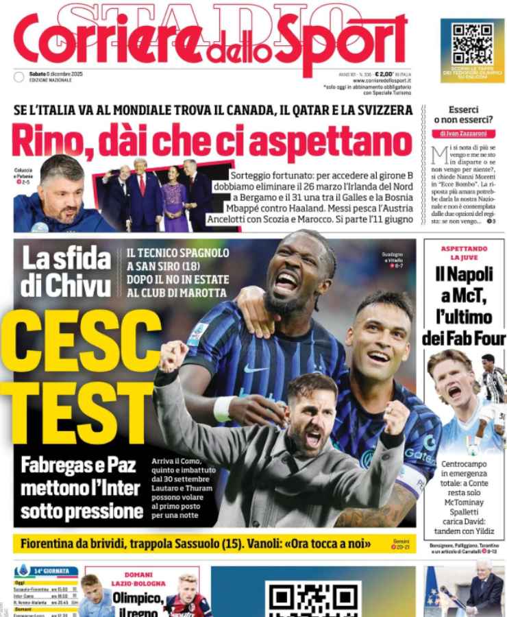 Il Corriere dello Sport, invece, apre concentrandosi sul grande match tra Inter e Como in programma nel pomeriggio, un test per la squadra di Fabregas e Nico Paz.