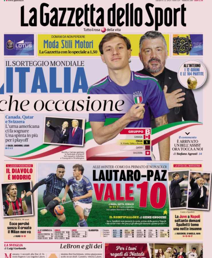 Focus principale di oggi sono i sorteggi dei gironi dei prossimi Mondiali. Per la Gazzetta l’Italia ha una grande occasione, visto il potenziale accoppiamento con Canada, Svizzera e Qatar.