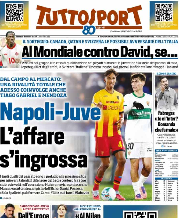 Tuttosport si proietta invece a Napoli-Juventus in programma domani sera, con un riferimento ai duelli di mercato tra le due squadre in vista di gennaio.