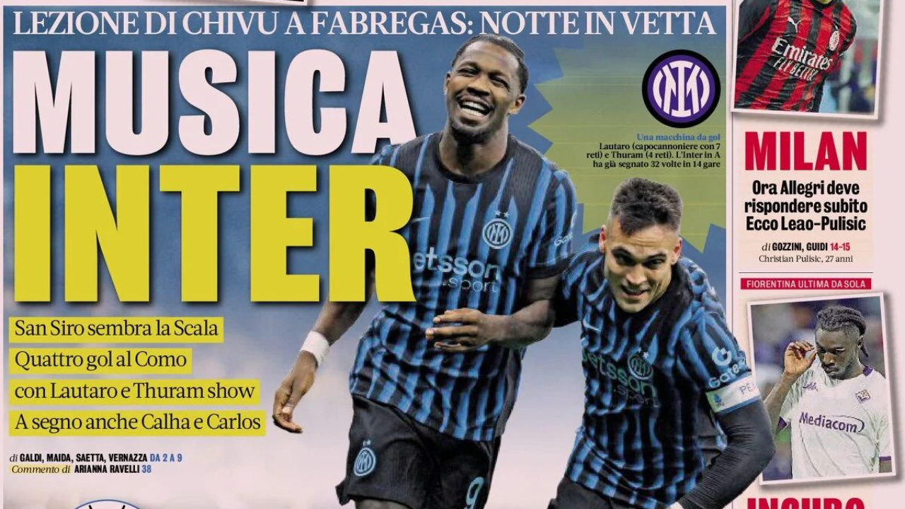 La Gazzetta dello Sport apre con la vittoria dell’Inter contro il Como, mentre sulla destra trovano spazio Milan e Fiorentina.