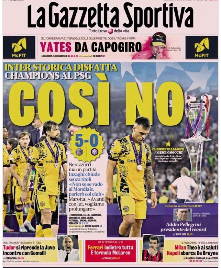 Tuttosport apre invece con “Disintegrata“. Il 5-0 incassato dall’Inter è infatti il passivo più grande di una finale di Champions League.