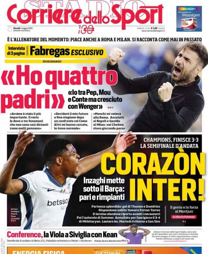 Il Corriere dello Sport si concentra sulla propria intervista a Cesc Fabregas e, ovviamente, anche sull’impresa sfiorata dall’Inter. “Corazòn Inter” è il titolo, per indicare il rimpianto di Inzaghi e i suoi di non essere riusciti a portare a casa qualcosa di più, specie dopo una settimana così difficile come quella nerazzurra.