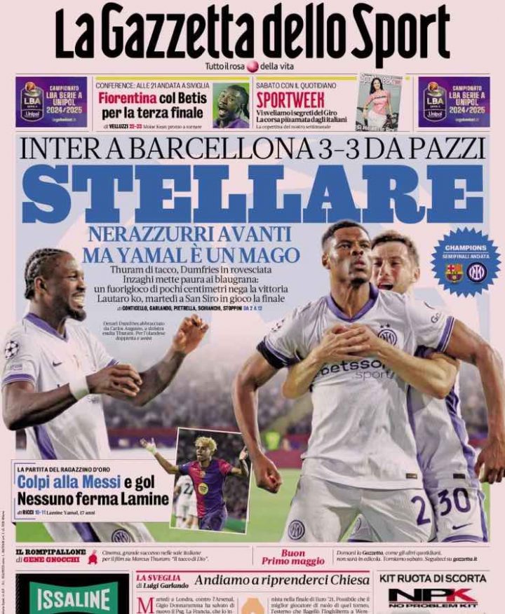 La Gazzetta dello Sport apre con il resoconto proprio di Barcellona-Inter. Un match definito “Stellare”, che però non basta. Al tacco di Thuram e alla rovesciata di Dumfries si oppongono i lampi di Lamine Yamal.