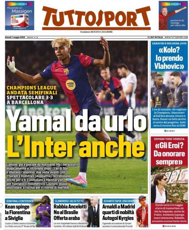 È il giorno dopo Barcellona-Inter di Champions League. Al Montjuic il match è finito con un incredibile 3-3 nel segno o di Denzel Dumfries e Lamine Yamal.