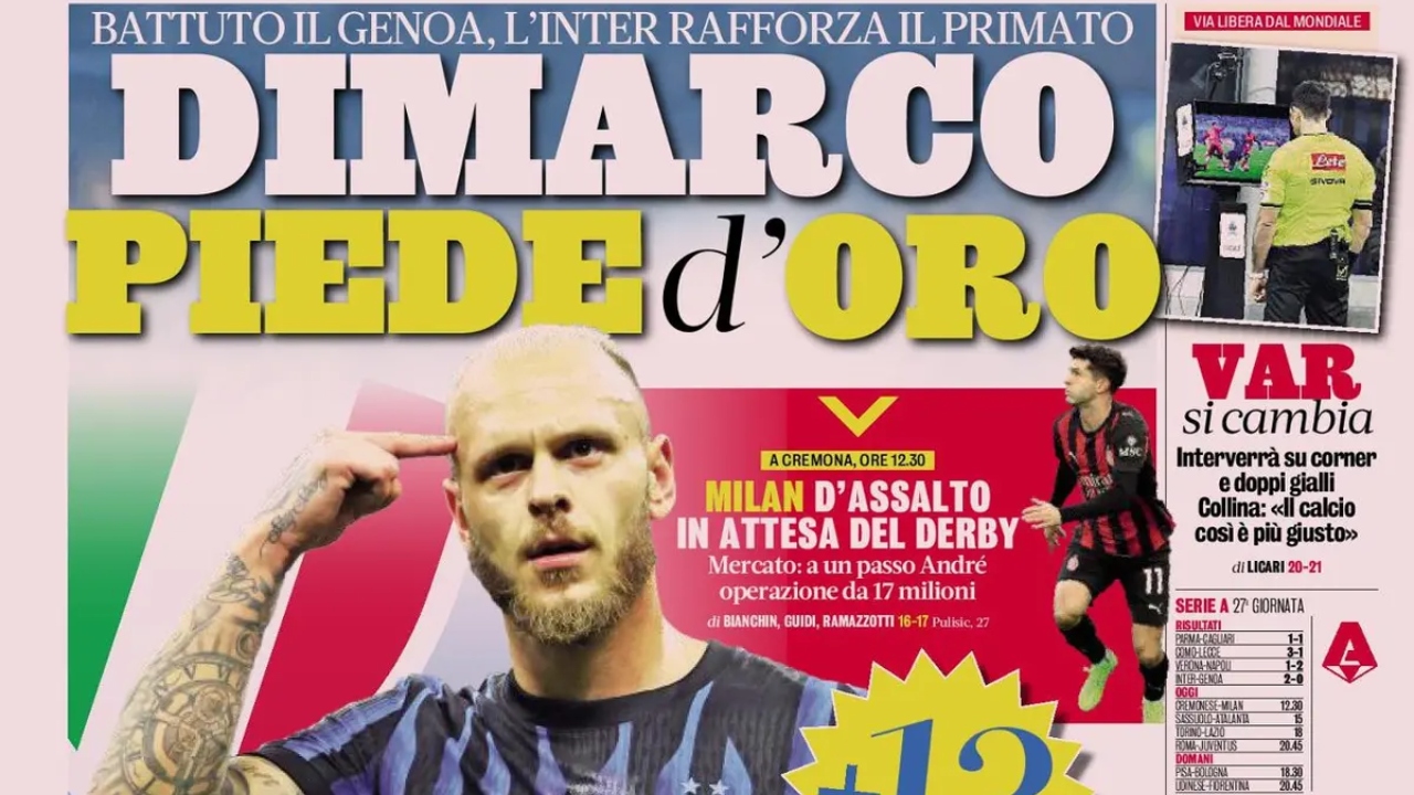 La Gazzetta dello Sport dà grande spazio in prima pagina a Federico Dimarco, trascinatore dell’Inter anche nella partita vinta contro il Genoa, che vale il momentaneo +13 sul Milan. Spazio anche al ritorno al gol di Lukaku e all’imminente scontro diretto per il quarto posto tra Roma e Juventus, oltre che alle novità che riguardano l’uso del Var.
