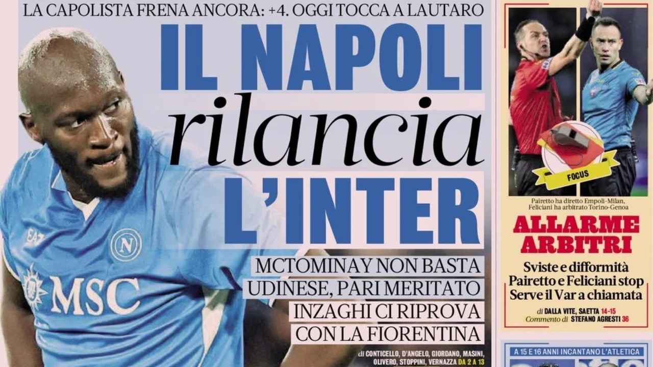 “FreNapoli” è il titolo in prima pagina del Corriere dello Sport. Il riferimento, chiaramente, è al pareggio per 1-1 rimediato contro l’Udinese. In basso, spazio alle vittorie di Lazio e Roma, giunte rispettivamente contro Monza e Venezia.