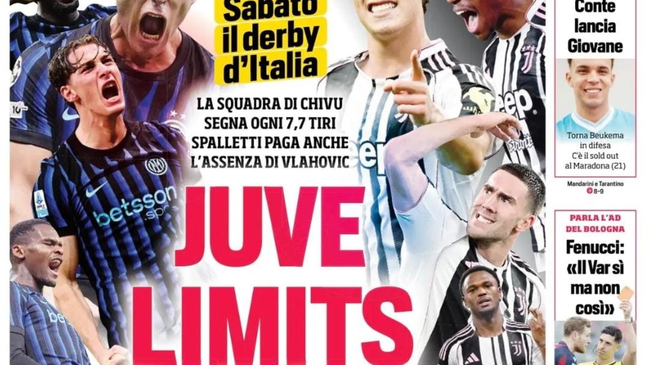 Il Corriere dello Sport si concentra già sulla prossima giornata di campionato: “Sabato il Derby d’Italia. Juve limits. Attacco Inter: 12 gol in più di Yildiz. David-Openda flop“.
