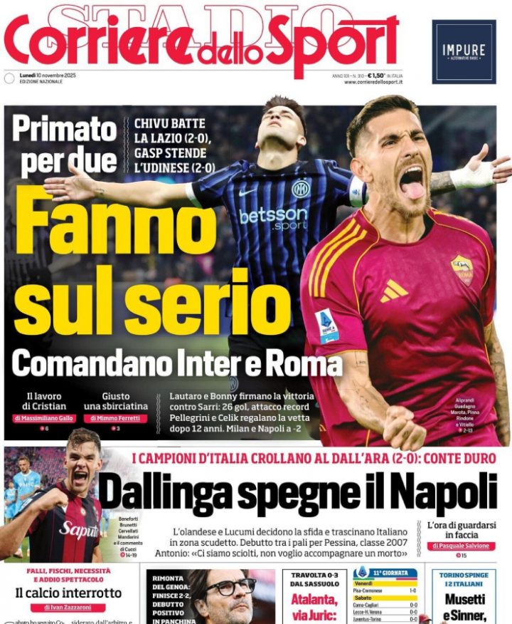 Anche il Corriere dello Sport si concentra su Roma e Inter, con in basso la sconfitta del Napoli a Bologna.