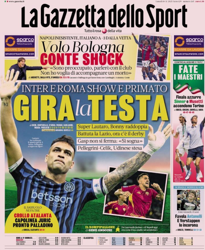 La Gazzetta dello Sport apre con le vittorie di Roma e Inter che portano le due squadre in vetta alla classifica. In alto trova spazio il Bologna.