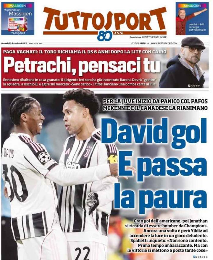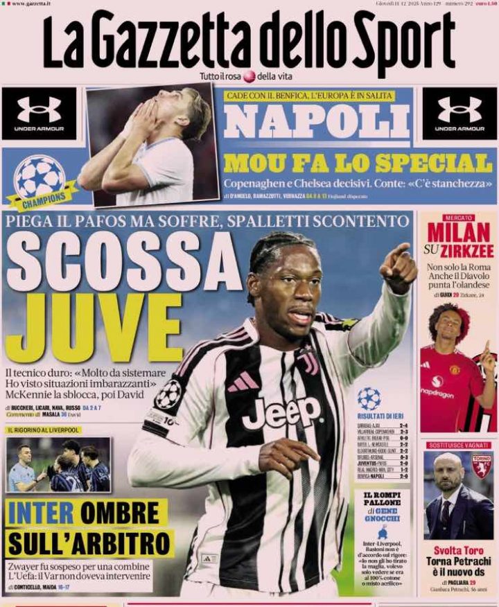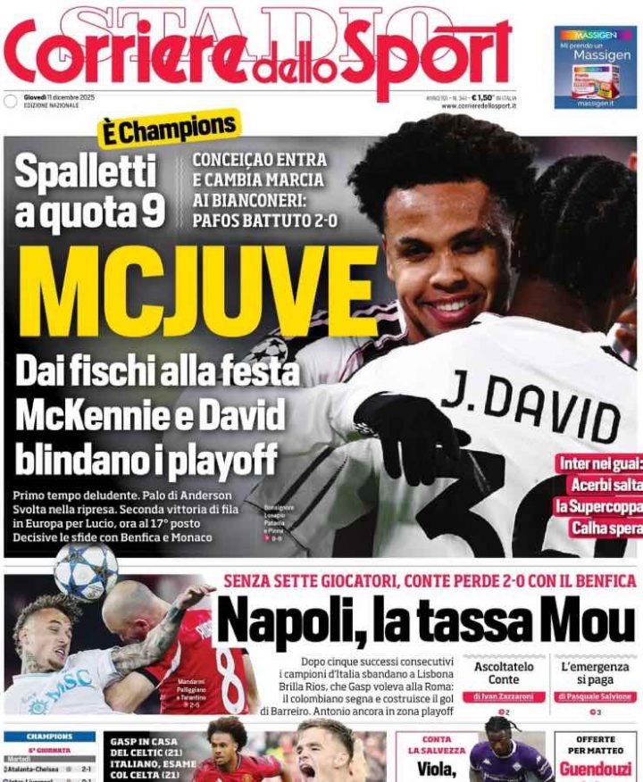 La Gazzetta dello Sport parte con la vittoria della Juventus contro il Pafos, arrivata grazie ai gol di McKennie e David. Spazio anche al Napoli, sconfitto in casa del Benfica 2-0.