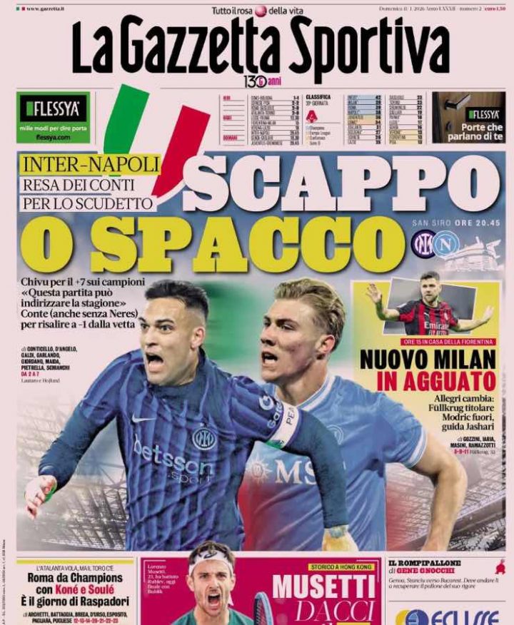 La Gazzetta dello sport apre con il big match tra Inter e Napoli in programma stasera, 11 gennaio, a San Siro: i nerazzurri possono allungare a +7, mentre gli azzurri cercano di avvicinarsi e puntano al -1 proprio dalla squadra di Chivu. Spazio anche all’impegno del Milan con la Fiorentina, con Füllkrug che si avvicina alla prima gara da titolare in rossonero.