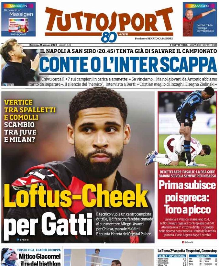 Tuttosport parte dal mercato di Juventus e Milan, per poi passare alla sconfitta esterna del Torino, che cade 2-0 in casa dell’Atalanta. Anche in questo caso spazio a Inter-Napoli, scontro diretto fondamentale per la classifica.