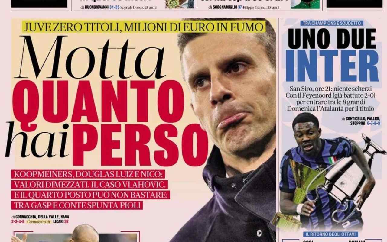 La Gazzetta dello Sport apre sulla Juventus, facendo un resoconto di quanto perso dopo l’eliminazione dalle coppe e la disfatta con l’Atalanta.