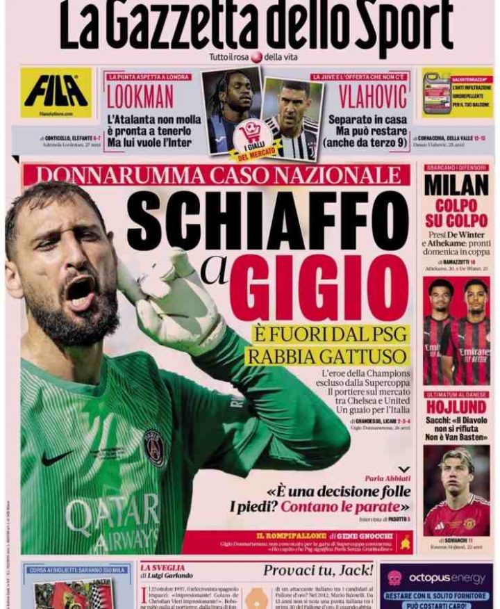 La Gazzetta dello Sport apre sulla non convocazione di Gigio Donnarumma per la finale di Supercoppa Europea tra il Tottenham e il PSG.