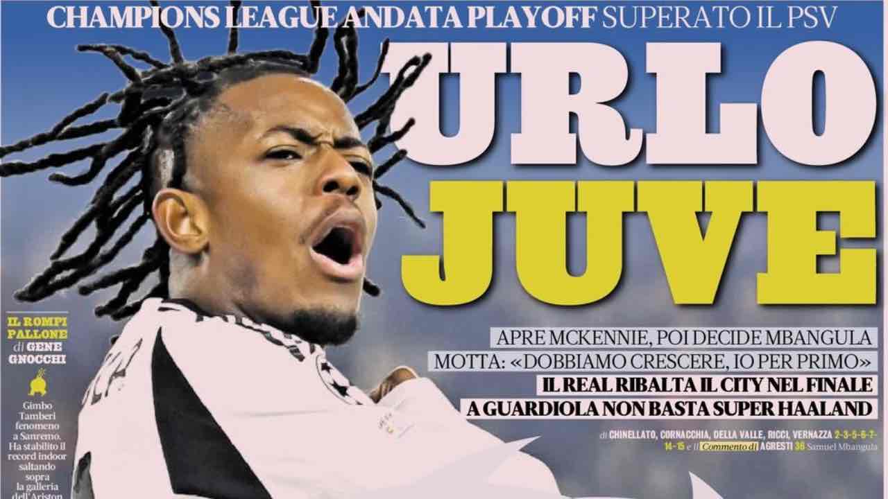 “Mbangol” esordisce invece il Corriere dello Sport. Stesso taglio della Gazzetta: la Juve soffre ma vince grazie al giovane esterno. In basso spazio a Manchester City-Real Madrid 2-3 e alla sfida del Milan, che dovrebbe scendere in campi con Pulisic, Leao, Joao Felix e Gimenez titolari. Sotto ancora trafiletti per Roma e Napoli, che perde Neres per infortunio.