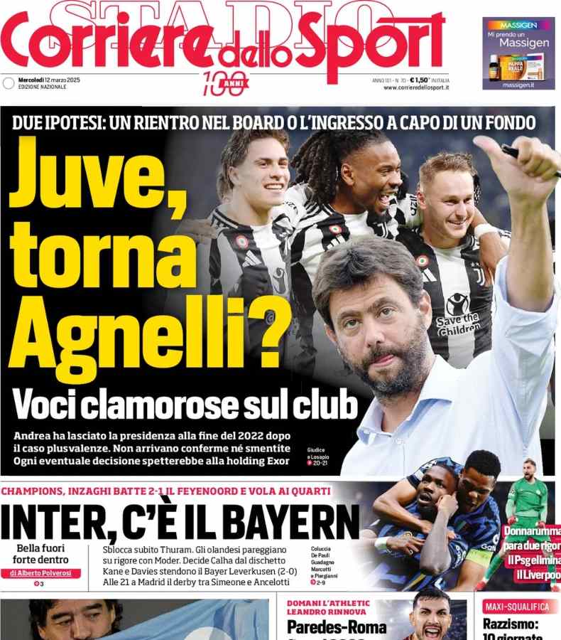 “Juve, torna Agnelli?” è il titolo del Corriere dello Sport che dedica ampio spazio al club bianconero. A seguire, ecco l’Inter ai quarti di finale di Champions League.