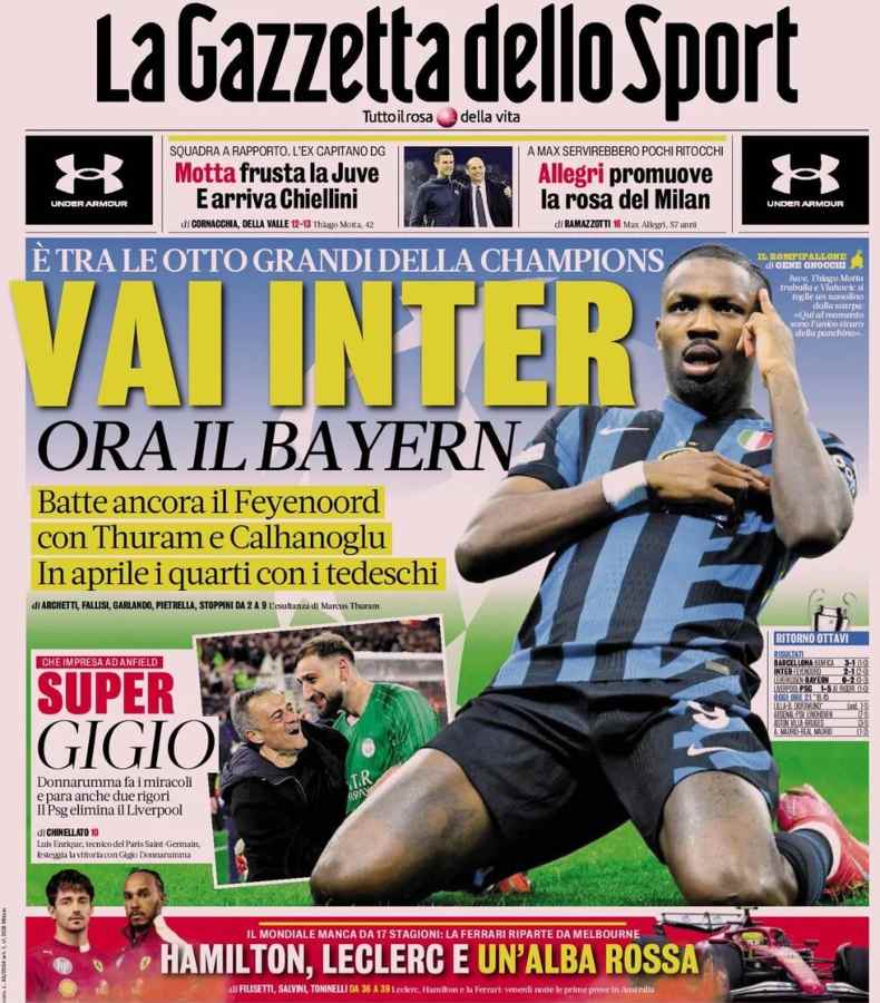 La Gazzetta dello Sport apre con il successo dell’Inter in Champions League: i nerazzurri hanno raggiunto i quarti di finale. In basso, spazio anche al PSG che ha superato il Liverpool, e alla Formula 1.
