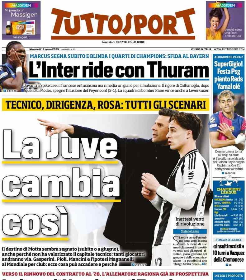Tuttosport apre con la situazione legata alla Juventus. In alto, spazio all’Inter e al passaggio ai quarti di finale di Champions League. Al lato, ecco il Barcellona che ha superato il Benfica.
