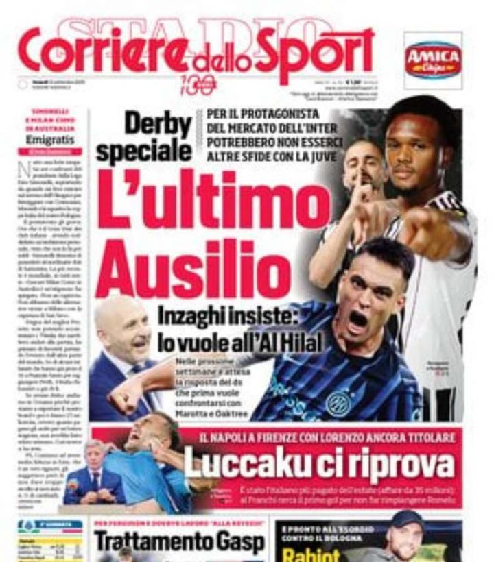 Il Corriere dello Sport apre con in primo piano Ausilio. Inzaghi, infatti, vorrebbe che il ds dell’Inter lo seguisse in Arabia Saudita all’Al-Hilal.