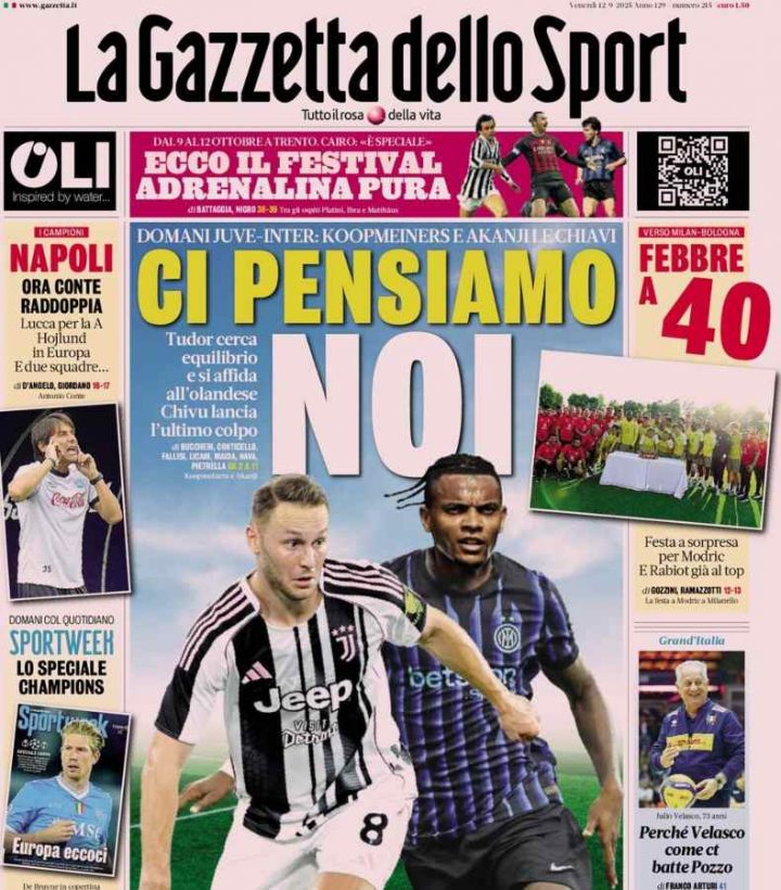La Gazzetta dello Sport apre ponendo l’accento su Juventus-Inter, derby d’Italia che si giocherà per la quindicesima volta all’Allianz Stadium di Torino. In particolare l’attenzione va su Koopmeiners, che dovrebbe partire dal 1′, e Akanji. L’olandese e lo svizzero potrebbero essere chiavi tattiche importanti.
