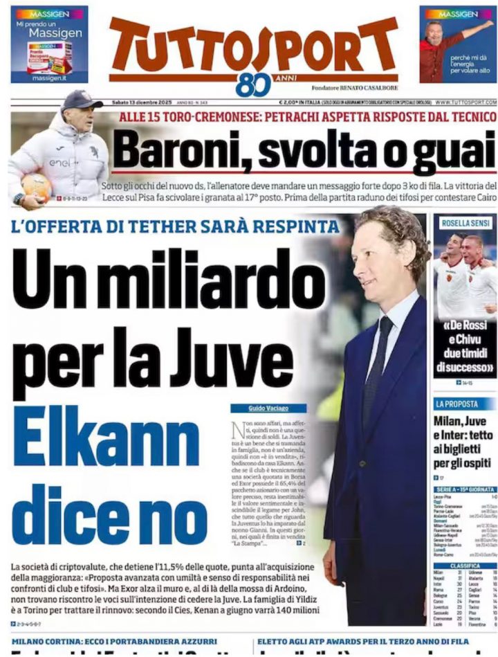 Tuttosport apre con il botta e risposta tra Tether ed Exor per la proposta d’acquisto della Juventus da parte della società di stablecoin. In prima pagina anche la situazione di Baroni al Torino.