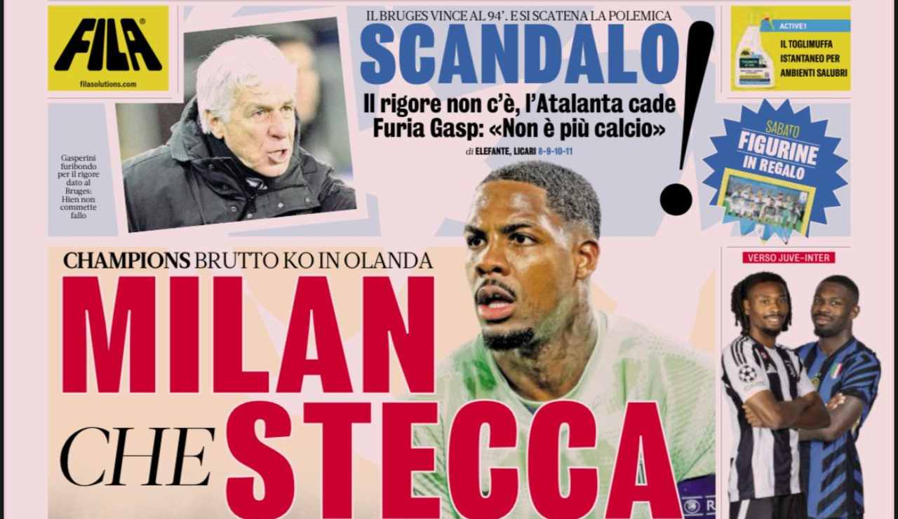 La concentrazione dei quotidiani sportivi si concentra sulla Champions League, in particolare sulle sconfitte di Milan e Atalanta contro Feyenoord e Bruges. Interesse anche per la sfida della Roma, impegnata in Europa League.