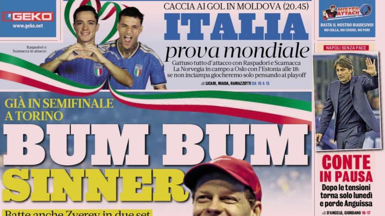 La Gazzetta dello Sport apre con la vittoria di Jannik Sinner contro Alexander Zverev alle ATP Finals di Torino. Occhi puntati anche sulla Nazionale, in campo alle 20:45 contro la Moldova e sul derby di Milano in programma subito dopo la sosta.