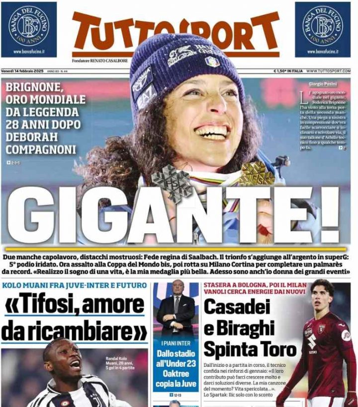 Tuttosport, pure, dedica spazio in apertura a Federica Brignone e sullo sfondo c’è l’anticipo di Serie A tra Bologna e Torino e le parole di Kolo Muani