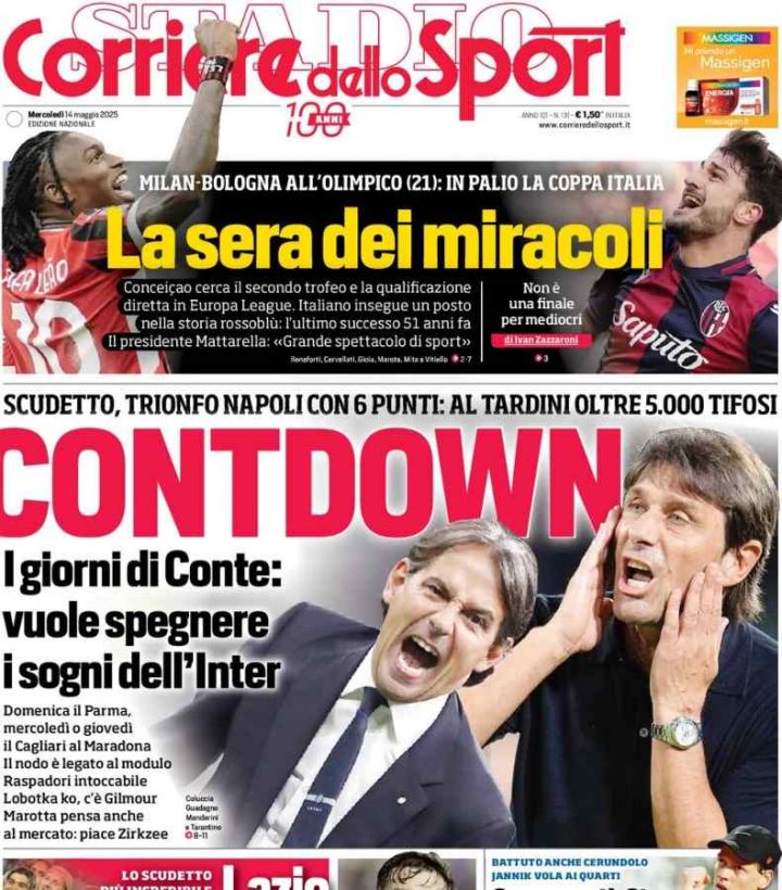 La gallery delle prime pagine dei principali quotidiani sportivi in edicola nella giornata di oggi, mercoledì 14 maggio 2025