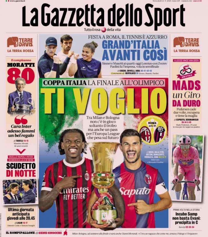 La Gazzetta dello Sport in apertura si concentra sulla finale di Coppa Italia in programma questa sera tra Milan e Bologna.
