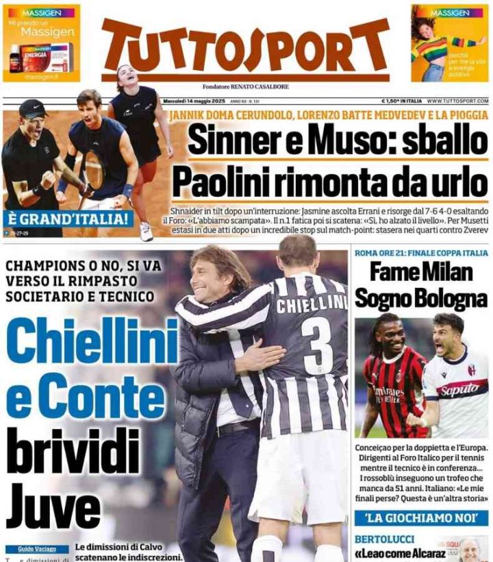 Tuttosport, invece, si focalizza sul futuro della Juventus che vorrebbe riunire Chiellini e Conte.