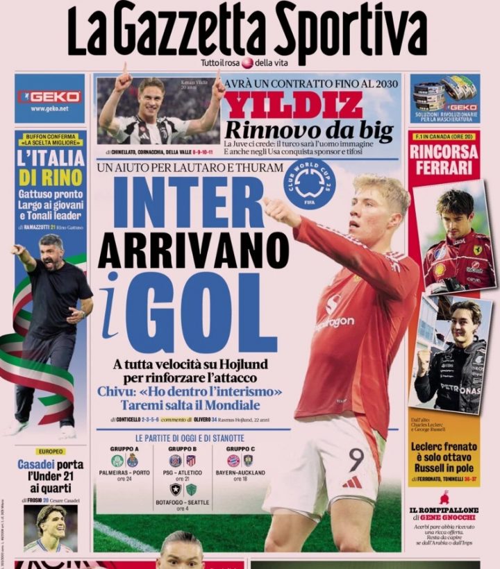 La Gazzetta dello Sport si concentra sul mercato dell’Inter, con le possibili operazioni in entrata dei nerazzurri. Spazio anche alla nuova Italia di Gattuso e all’U21, qualificatasi ai quarti di finale dell’Europeo di categoria grazie alla vittoria contro la Slovacchia.