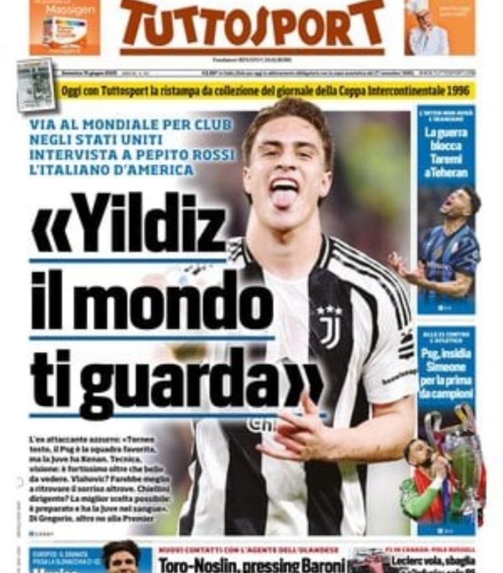 Tuttosport in prima pagina presenta Kenan Yildiz in chiave Mondiale: il numero 10 della Juventus può essere grande protagonista del Mondiale per Club, che si è aperto nella notte con il pareggio tra Inter Miami e Al Ahly. Spazio anche all’appuntamento di questa sera, quando PSG e Atletico Madrid si affronteranno al Rose Bowl Stadium.