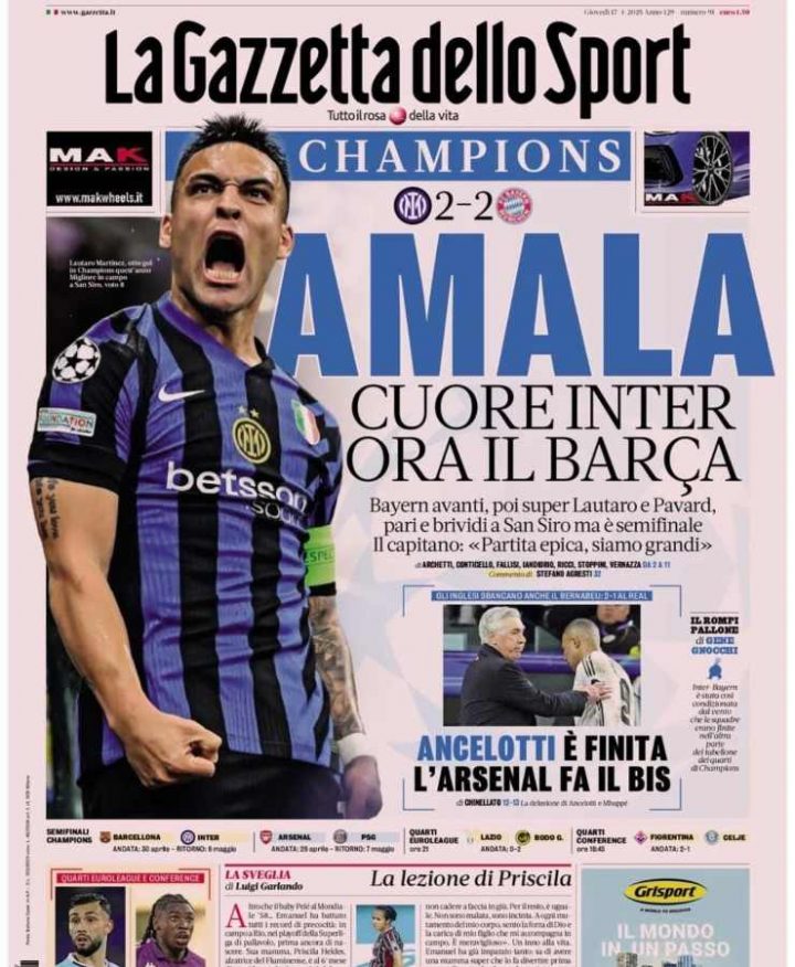 La Gazzetta dello Sport apre sul passaggio dell’Inter in Champions League contro il Bayern Monaco, titolando “Amala”. In basso, invece, un piccolo riquadro su Fiorentina e Lazio che oggi saranno impegnate rispettivamente in Conference ed Europa League. Al centro, uno spazio dedicato all’eliminazione in Champions del Real Madrid per mano dell’Arsenal.
