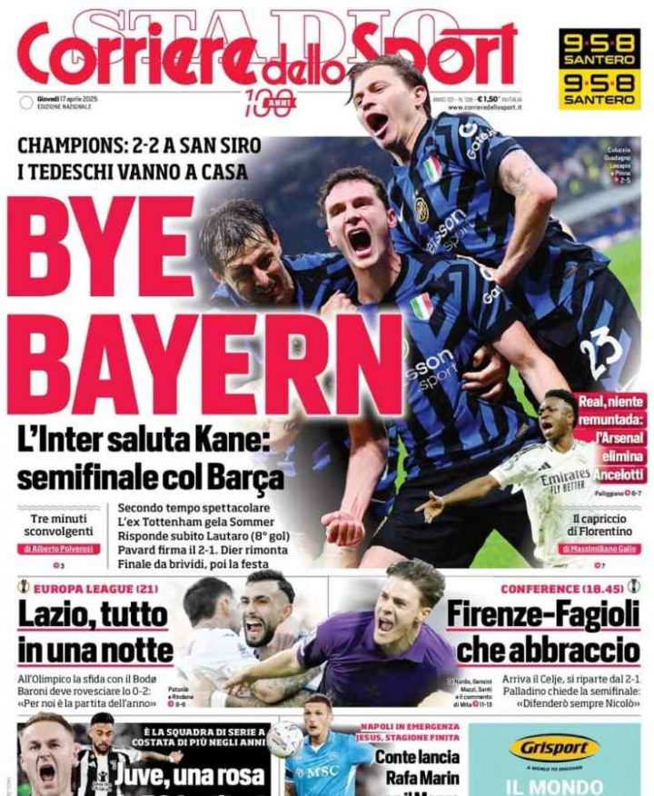 Il Corriere dello Sport dedica la copertina al passaggio di turno in Champions dell’Inter ai danni degli uomini di Kompany, aprendo con “Bye Bayern”. Taglio basso dedicato a Lazio e Fiorentina.